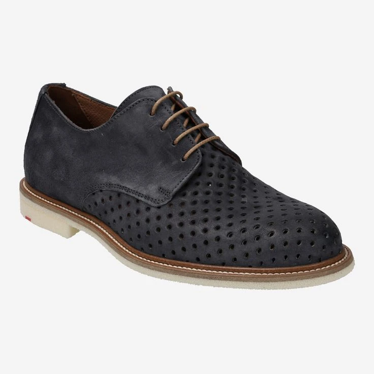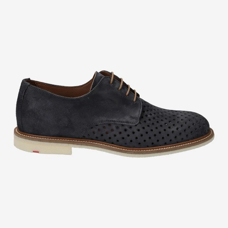 Genießen Sie mit PARKER einen raffinierten Derby-Schnürschuh der besonderen Art! Das blau-graue Veloursleder ist im vorderen Schuhbereich durch runde Lochungen teiltransparent, wodurch Sie einen luftigen, sommerlichen Look erhalten. Die luftig geschaumte, leichte Gummisohle ist rutschfest, und unterstreicht den individuellen Charakter dieses Sahnestücks. Eine helle Kontrastleiste vollendet das individuelle Gesamtbild detailverliebt.